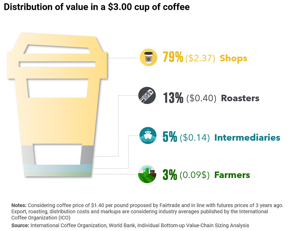 The best way to wrap our heads around this question is to look at the economics of a coffee cup and how it is distributed across the key players of the value chain.