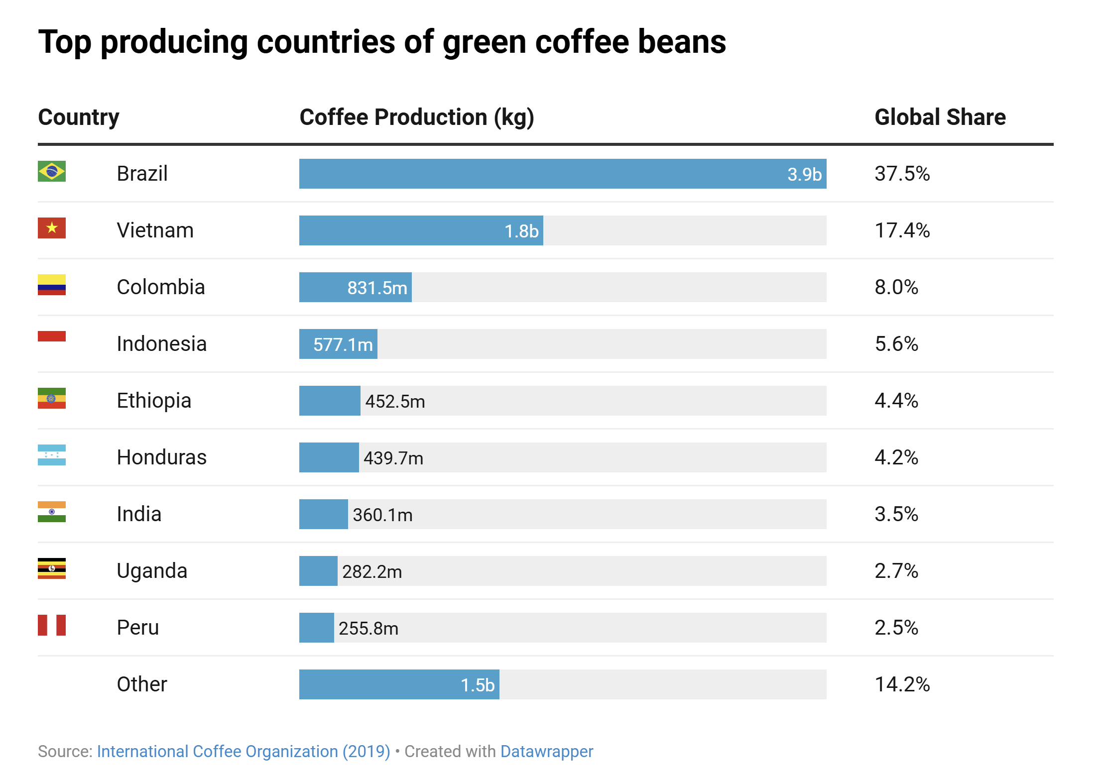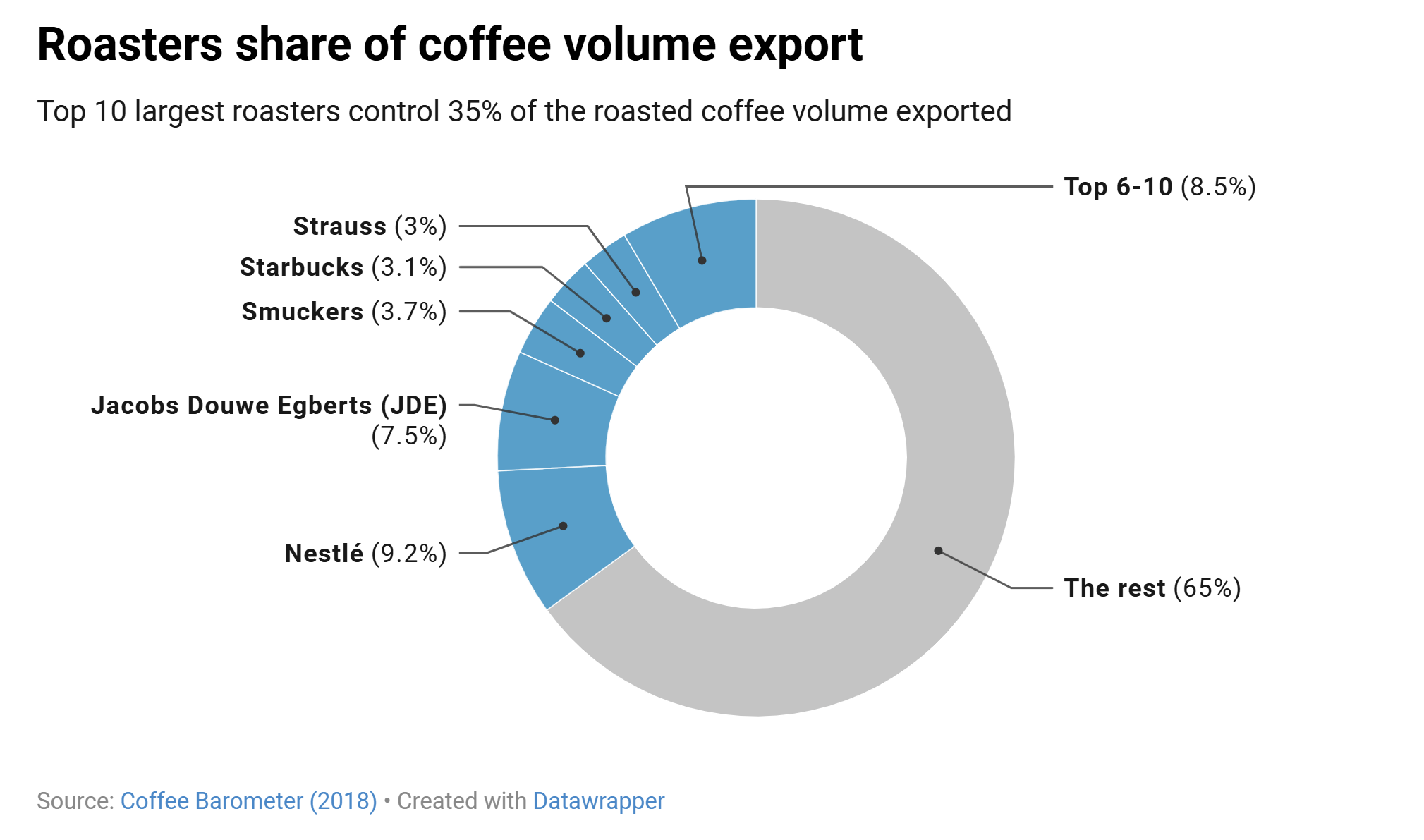 The biggest winners: Roasters and retailers control over 90% of the value in the $200+ billion coffee industry. Big producers such as Nestle — known for Nescafe and Nespresso — and JDE — with many brands around the world including Carte Noire and L’Or — are benefiting from operating at large scale and with extremely healthy profit margins due to the very low raw material cost and the much higher price point commanded by roasted coffee. Coffee is often roasted in Europe, in countries like Switzerland, Italy and France, and North America. According to the ‘Coffee Barometer report, the highly profitable nature of this sector has recently resulted in a series of consolidations, during which largest roasters acquire smaller players to control market share.