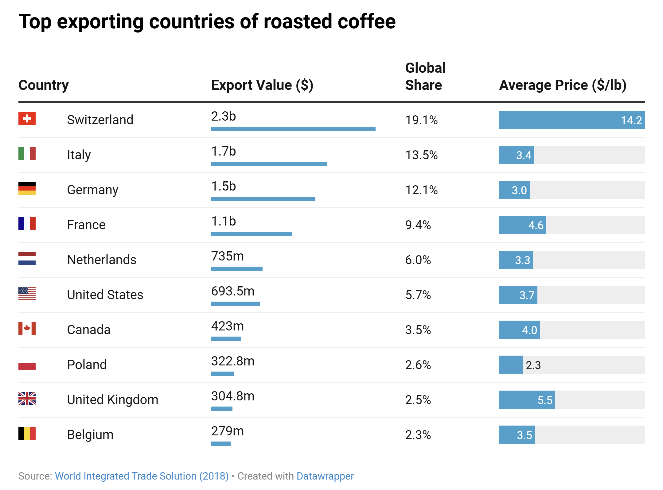 Roasting often occurs on large scale and rarely in the coffee producing regions. The top 10 roasting and exporting nations do not include a single coffee producing nation. Advanced economies with higher GDP per capita are in control of this part of the value chain. They purchase the green beans at very low rates from the coffee producers, roast them and export them at a premium. Switzerland exports, on average, the priciest roasted coffee in the world, followed by Italy, Germany and France. Compared to the minimum green coffee prices published by Fairtrade of around 1.4$ per pound, the value in roasting coffee bean is much higher with prices ranging from $3 to over $14 per pound for coffee roasted in Switzerland — 10x the Fairtrade green coffee farmer prices.