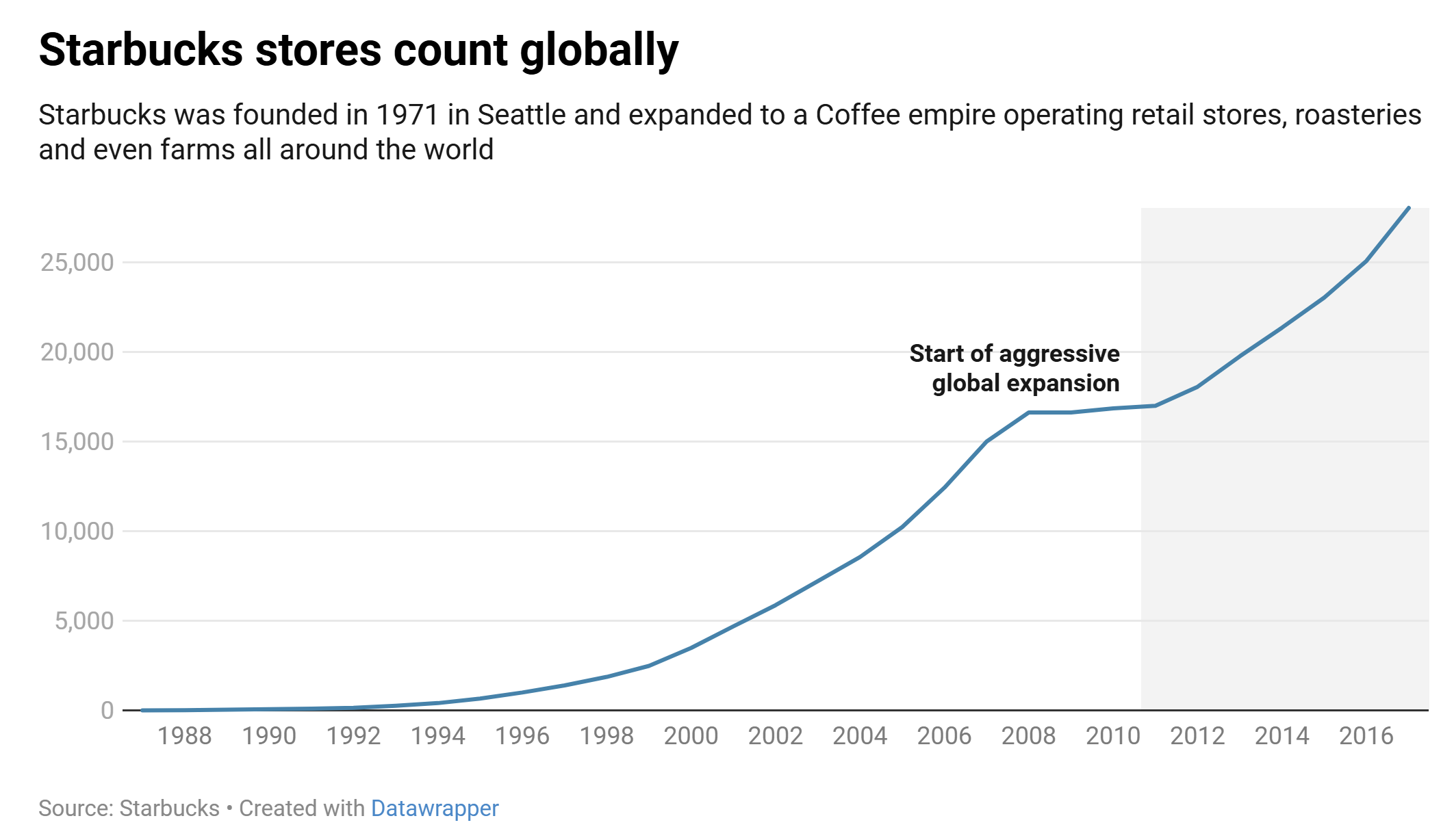 Retailers are also some biggest winners in the coffee business. Starbucks is the prime example, with its meteoric rise from humble beginnings in 1971 to a $90 billion coffee empire with a commanding presence across the entire coffee value chain. Starbucks buys coffee from all around the world, but also owns its own farms in Latin America and roasteries around the world. The economics of controlling the value chain has allowed Starbucks to maximize margins while controlling product quality and building a brand that currently dominates the coffee retail sector, with a widespread presence of nearly 30,000 stores globally.