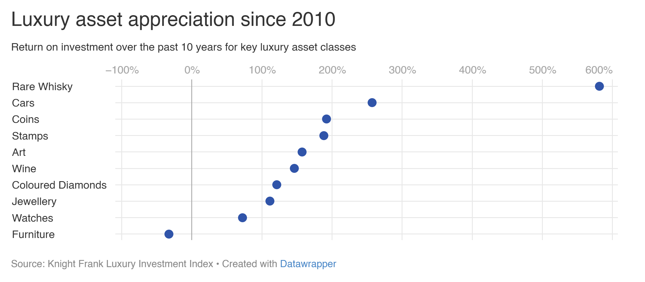 But what if I told you that whisky rivals gold as a great store of value and a reliable medium to long-term investment? Over the past 10 years, demand for whisky has risen significantly due to consumption growth across large markets like China and an increasing number of knowledgeable consumers flocking towards the more refined whiskies. Old and rare whiskies have been mostly impacted due to their limited supply. Since 2010, rare whisky appreciated by over 500%, eclipsing returns of investments in other key luxury asset classes such as collectible coins, wine, and art. Moreover, if compared strictly to the US stock market, which has seen the longest bull run in history, an investment in rare whisky would be worth 3 times as much.