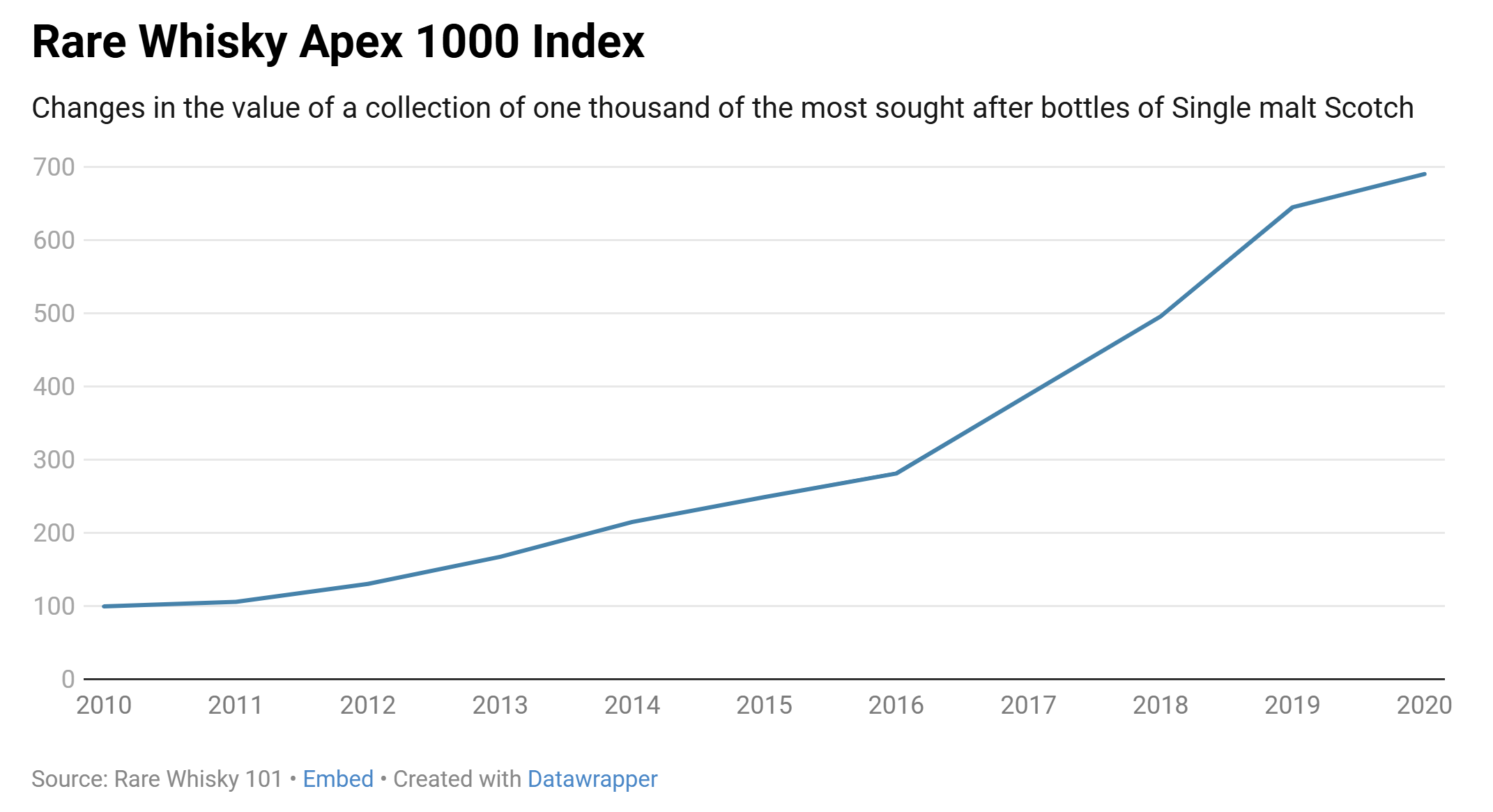 Rare whiskies, as an asset class, have not shown signs of weakening in the foreseeable future. If we look exclusively at the 1,000 most sought-after Scottish single malt whisky bottles measured in the Rare Whisky Apex 1000 Index, we observe that these unicorn bottles increased by almost 7-fold since 2010 and are still rising even throughout 2020 and the unstable markets.